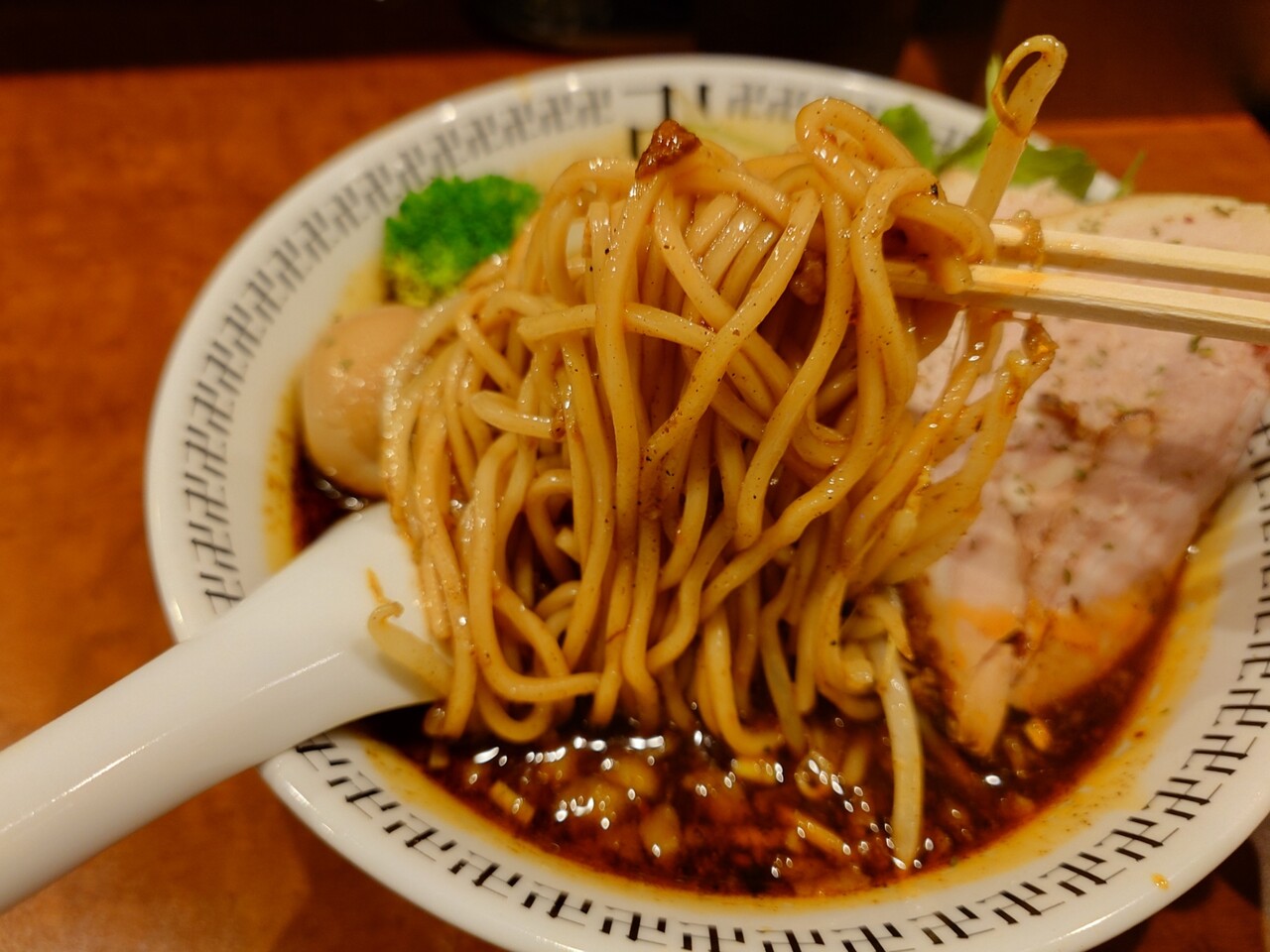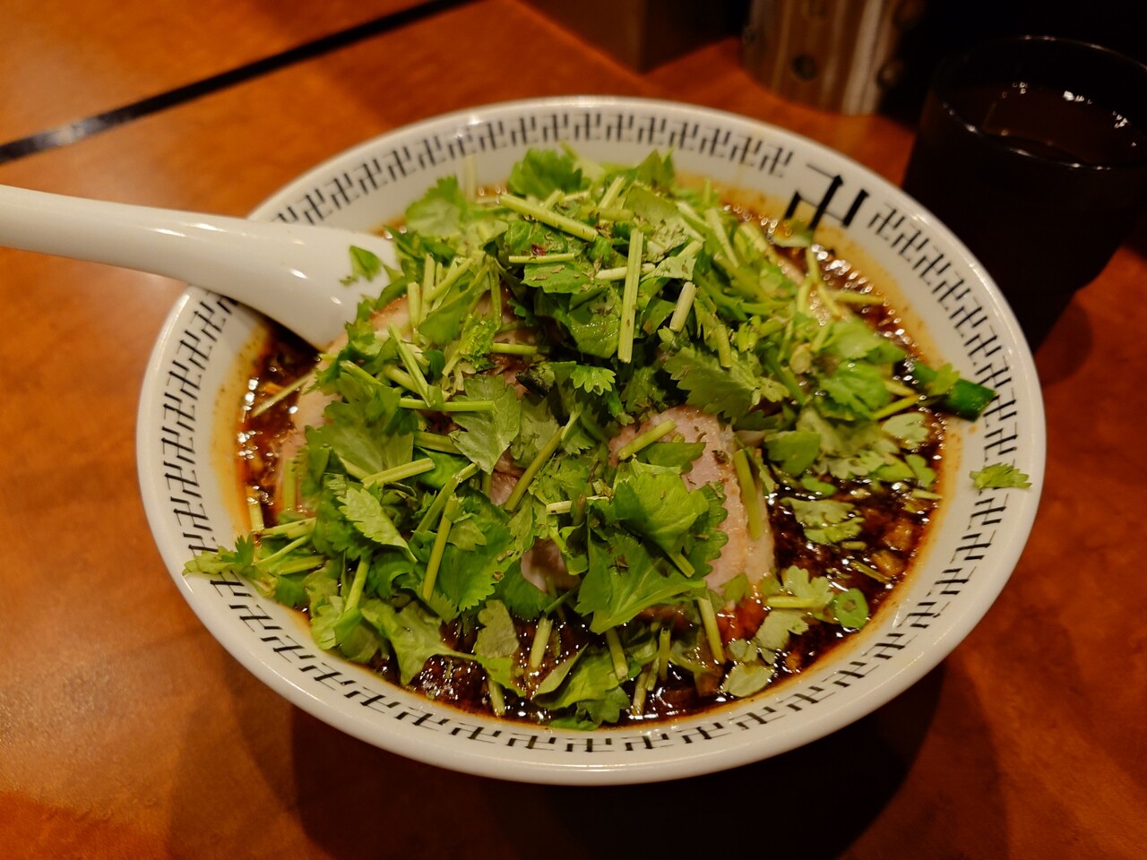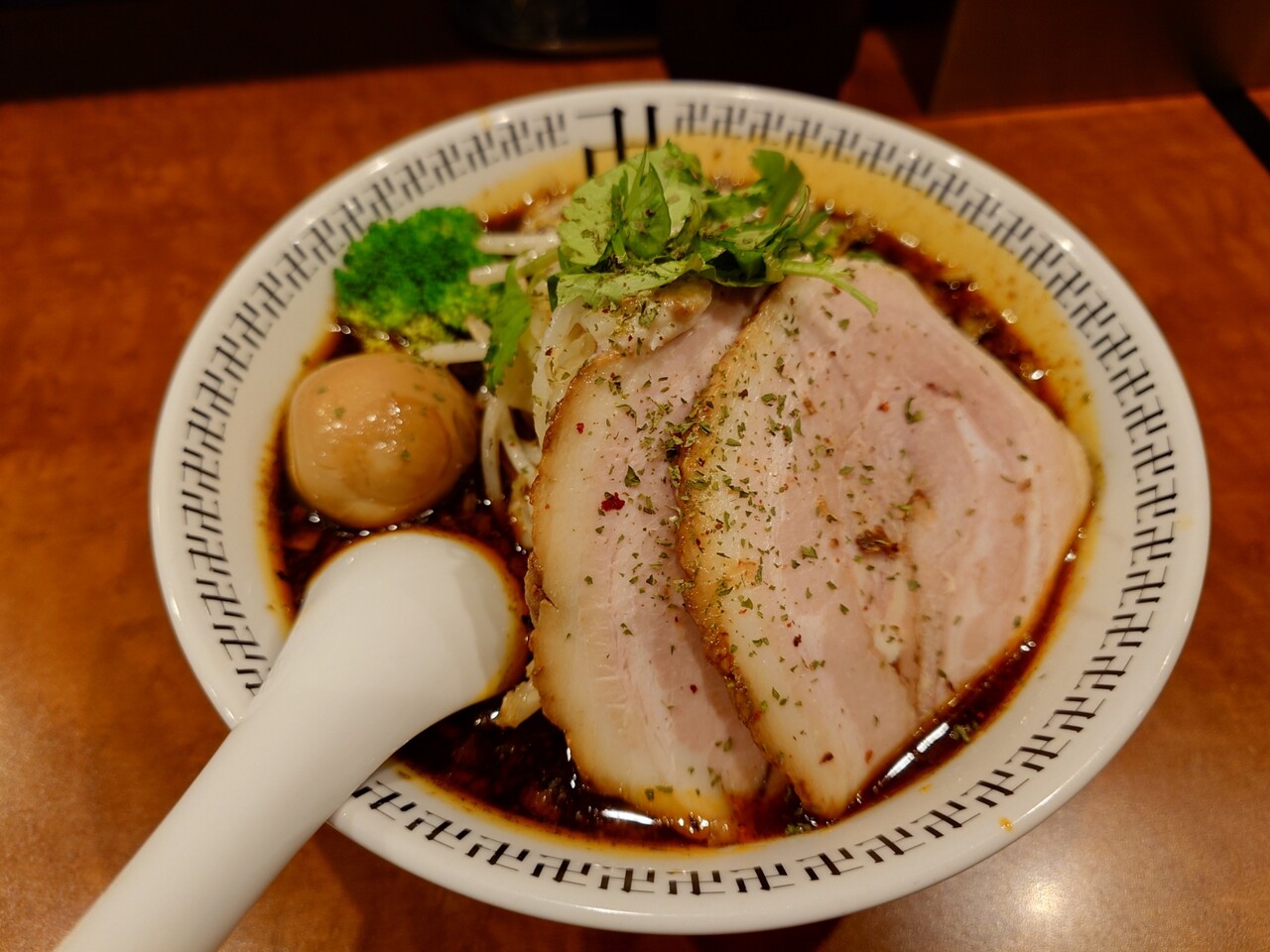 黒っぽいスープにうまそうなチャーシュー、そして煮卵にパクチーがちりばめられています。