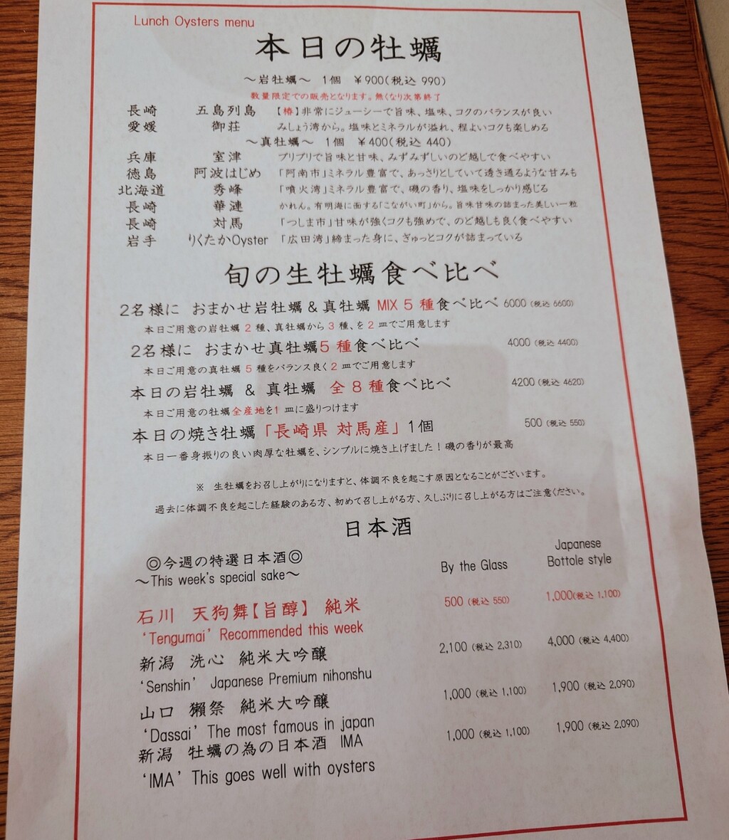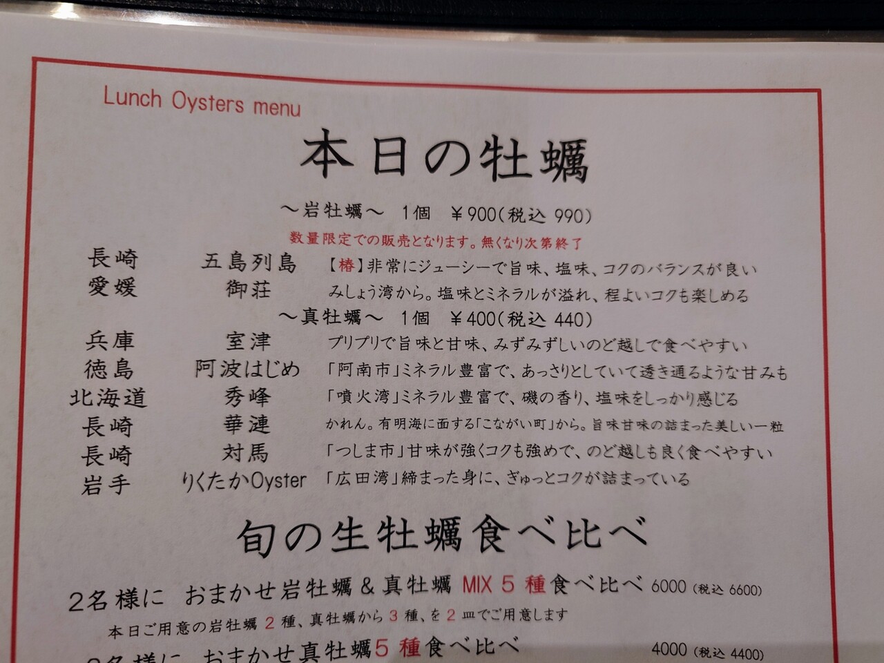 生牡蠣は常時6〜10種類ほど揃っており、1ピース440円(税込)から楽しめるのが特徴です。数量限定の岩牡蠣や、日本酒も揃っています。