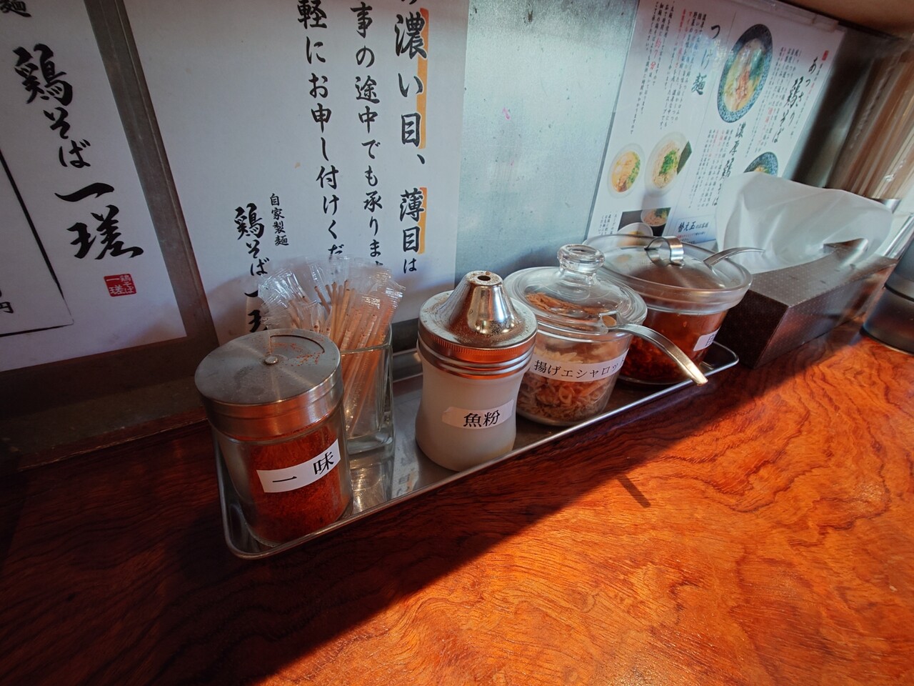 トッピングも豊富で一味、魚粉、揚げエシャロット、自家製辣油をお好みで