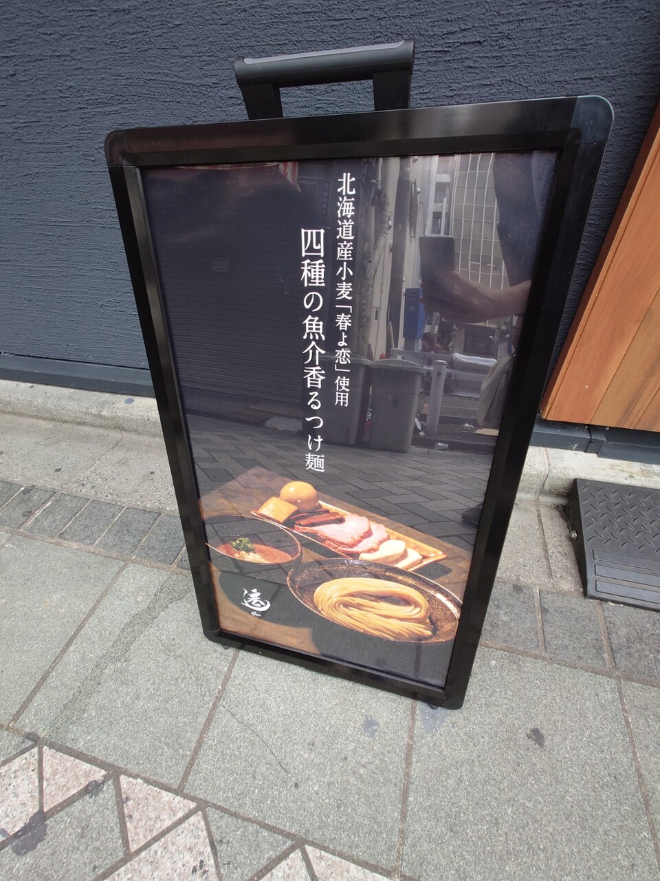 目印の看板「北海道産小麦”春よ恋”使用 四種の魚介香るつけ麺」