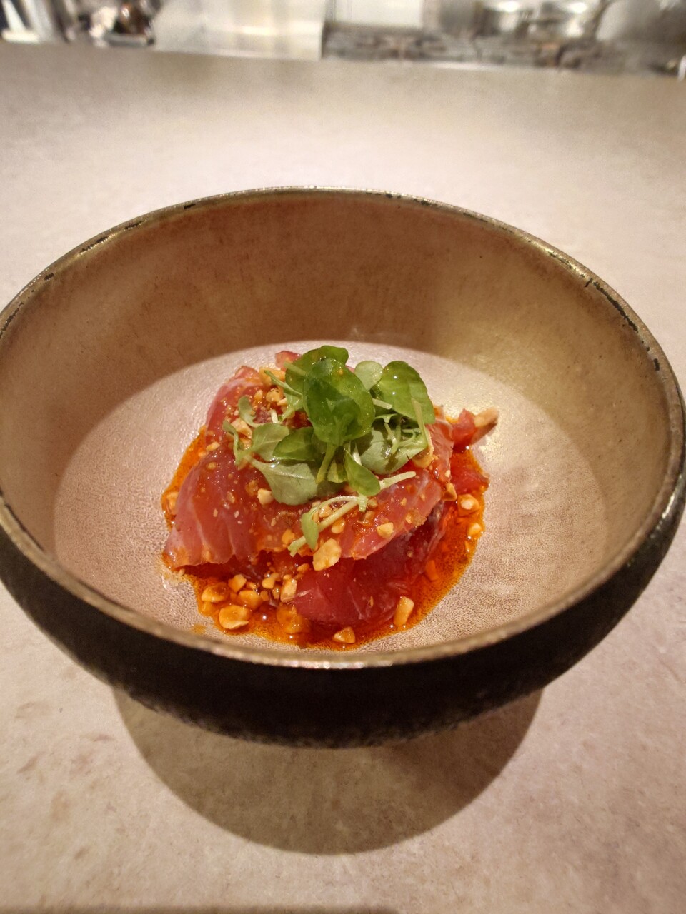千葉県勝浦産のカツオとニョラ(赤パプリカ)ソースの一品