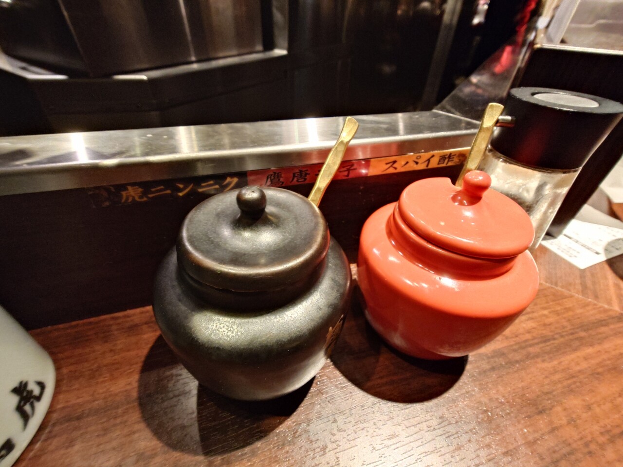 虎ニンニク、鷹唐辛子、スパイ酢と3種類の味変アイテムがあります